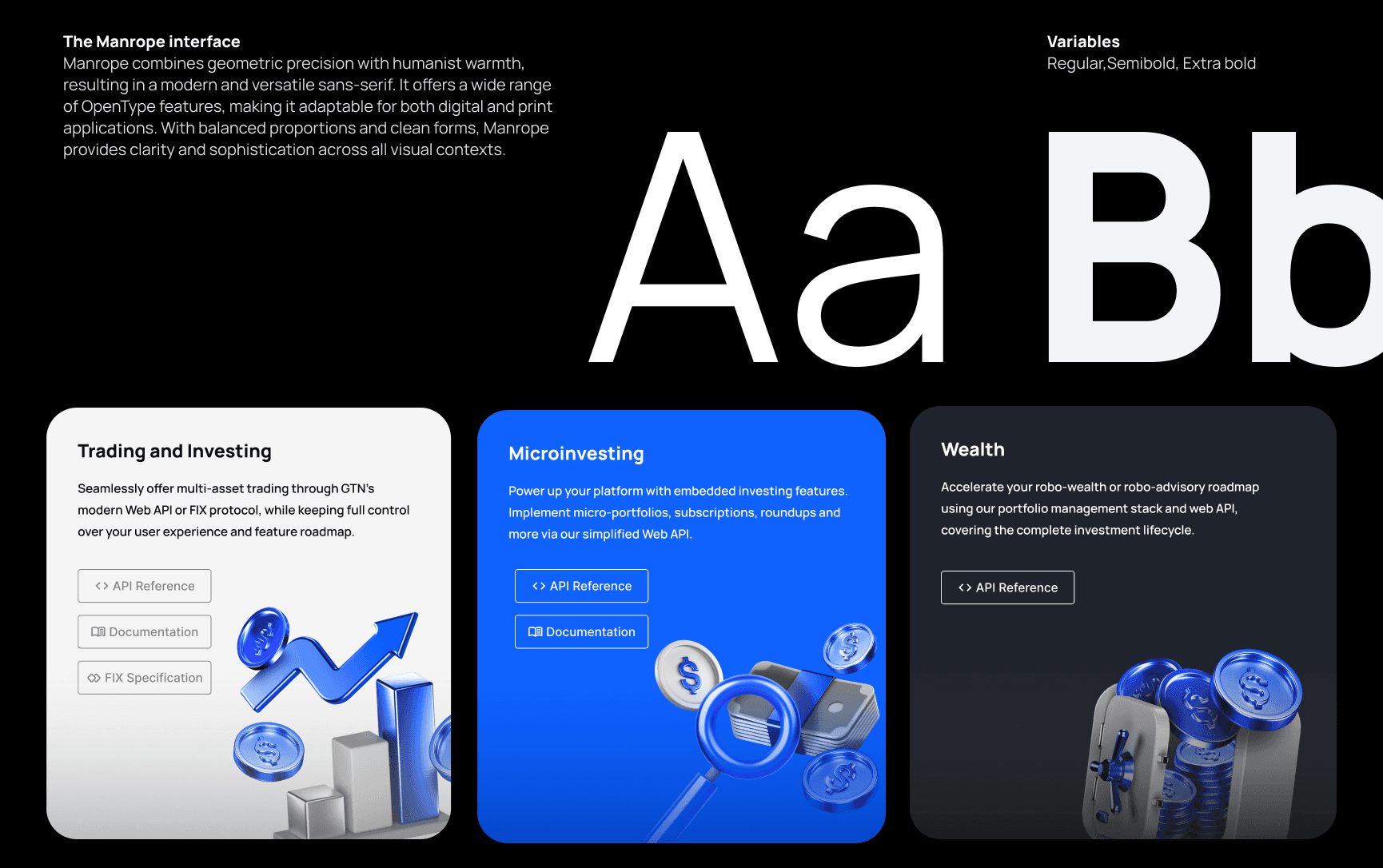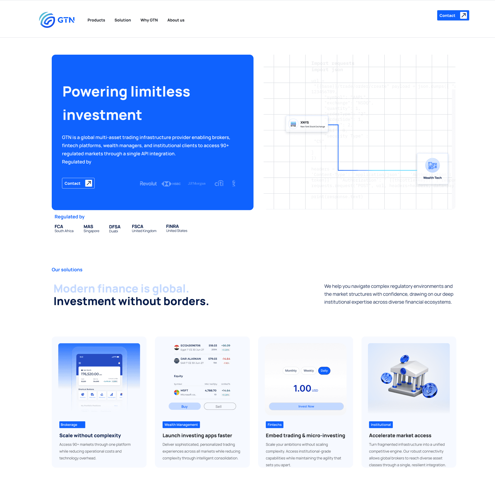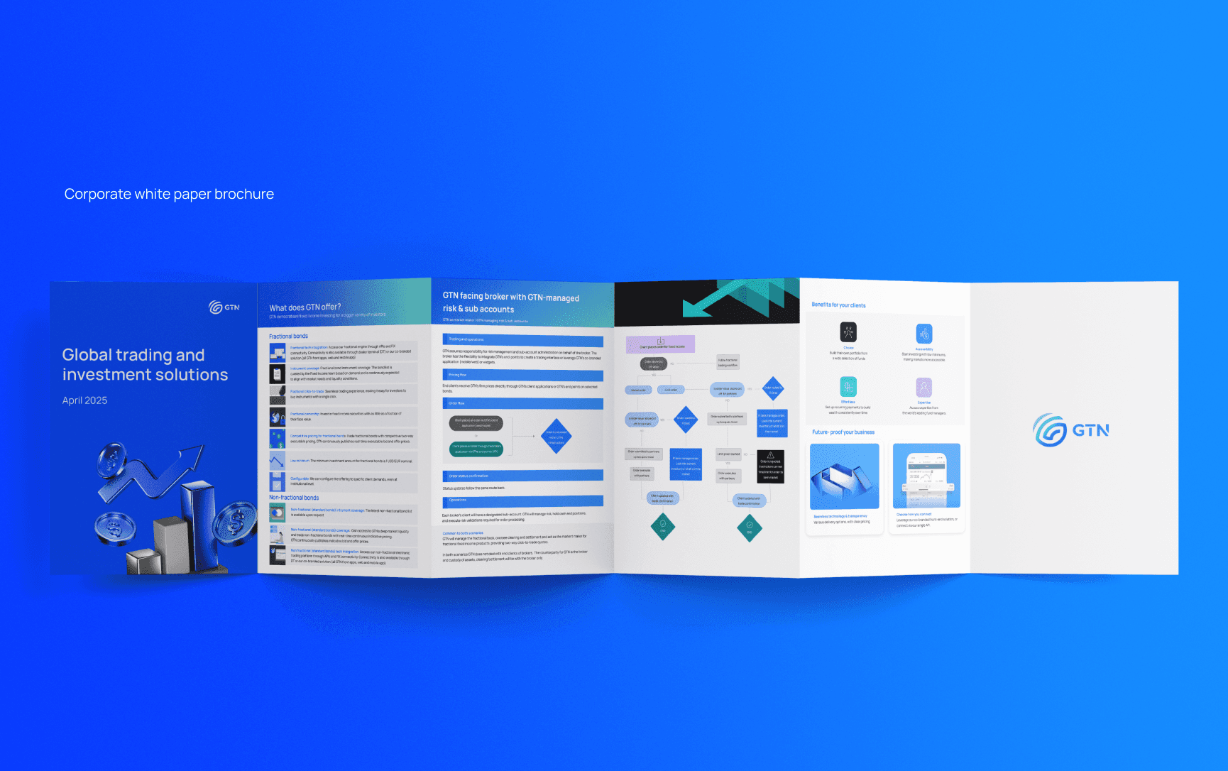 The Brief GTN is a global investment infrastructure provider, a single API giving brokers, banks, asset managers, and fintech platforms access to 90+ regulated markets and multiple asset classes across jurisdictions worldwide. The company occupies a rare position in the market: it has the agility of a fintech and the depth of an institutional player. The rebrand's goal was to make that positioning visible. GTN needed to sit confidently beside fintech-native competitors, while simultaneously signalling the institutional credibility that differentiates it from them. My Role Lead designer within the marketing team, reporting to the CMO. I worked across a multidisciplinary team including a web designer, product developers, regional campaign managers, sales teams, event booth designers, and senior stakeholders. The Process I began with competitive research, mapping how GTN's key competitors presented themselves visually and what positioning gaps existed. From that I built a rebrand strategy and creative direction, then executed it across every GTN touchpoint: brand identity, design system, website, social media, event spaces, marketing collateral, motion graphics, and embedded product UI. The sitemap and information architecture were rebuilt from the ground up to reflect GTN's expanded product suite and global regional structure. The Outcome The rebrand is currently in its final stage, with the GTN website scheduled to launch imminently, marking the first time the full visual identity system will be live across all digital touchpoints simultaneously. In advance of the website launch, the rebrand supported multi-region LinkedIn awareness campaigns across the US, LATAM, and APAC markets, providing the first real-world test of the new brand's performance at a senior audience level. Across three campaigns the creative generated over 67,000 impressions, reached approximately 4,900 unique decision-makers, and delivered 357 total clicks. The US campaign achieved an average CTR of 0.81% — nearly double the US B2B fintech industry standard of 0.40%–0.45%. Senior decision-makers engaged with the refreshed GTN brand across institutional banks and fintech platforms including Morgan Stanley, Kotak Mahindra Bank, ICICI Bank, BTG Pactual, Bradesco, UOB, CIMB, Fidelity Investments, and BNY Pershing — precisely the audience the rebrand was designed to reach. Top job titles engaging with the campaigns included Partners, Vice Presidents, Senior Directors, and Investment Directors across all three regions. The Americas homepage generated 971 sessions and 892 active users during the US campaign period. The global homepage generated 1,852 sessions and 1,600 active users during the LATAM campaign window. The full impact of the rebrand will be measurable upon website launch, at which point GTN's repositioned identity as the bridge between fintech agility and institutional expertise will be fully visible in market for the first time.